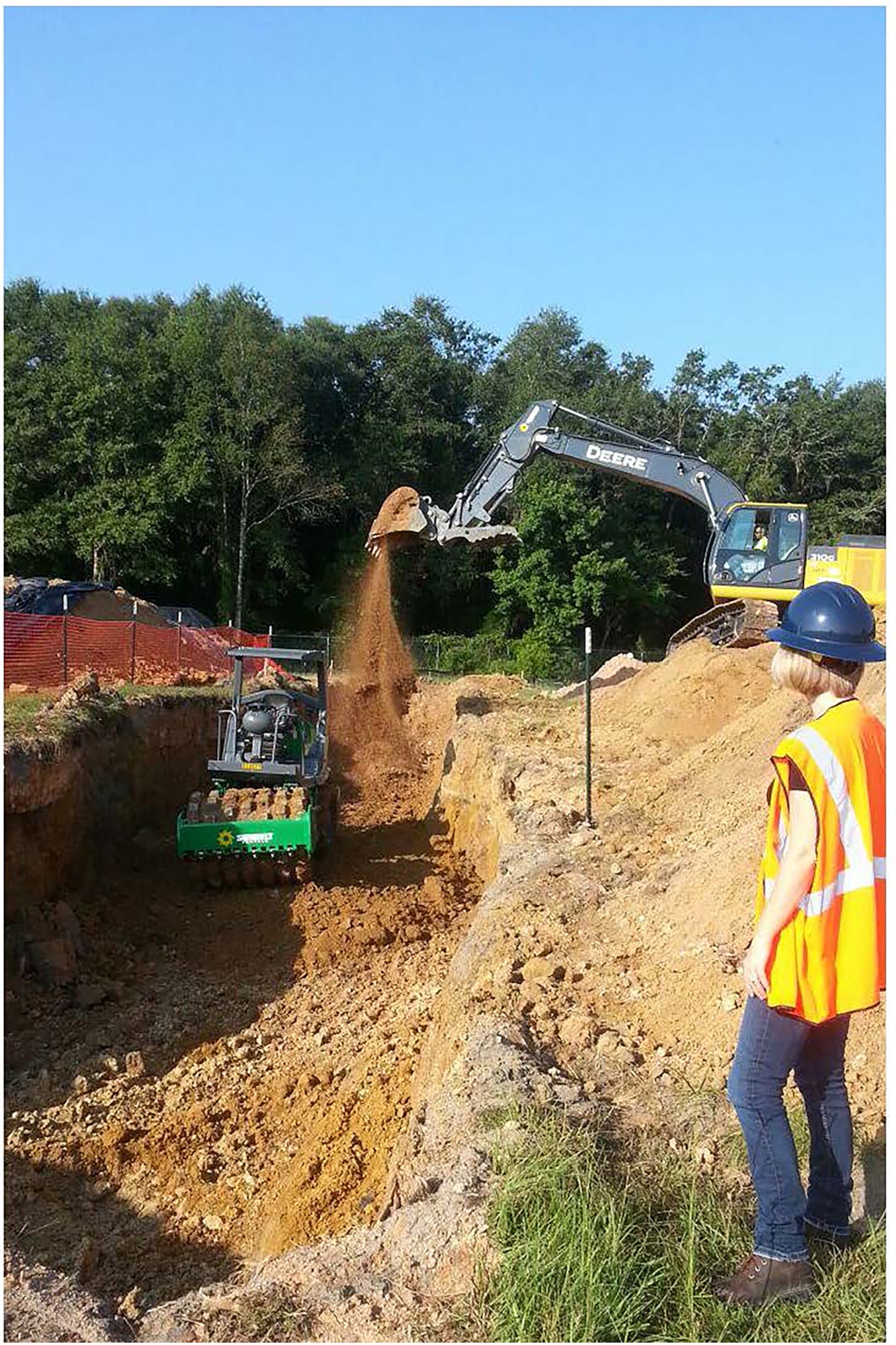 Lori Burnam, member of the Air Force Civil Engineer Center’s Robins Installation Support Team in Georgia, observes as an excavator backfills a former landfill trench. In 2014, approximately 11,000 tons of soil and waste were removed from the Former Burma Road Landfill to remove future land use controls at the site. Once the waste and soils were removed, clean soils were brought on-site. Burnam was the winner of the Thomas D. White Environmental Award in the environmental restoration team/individual category. (Courtesy Photo)