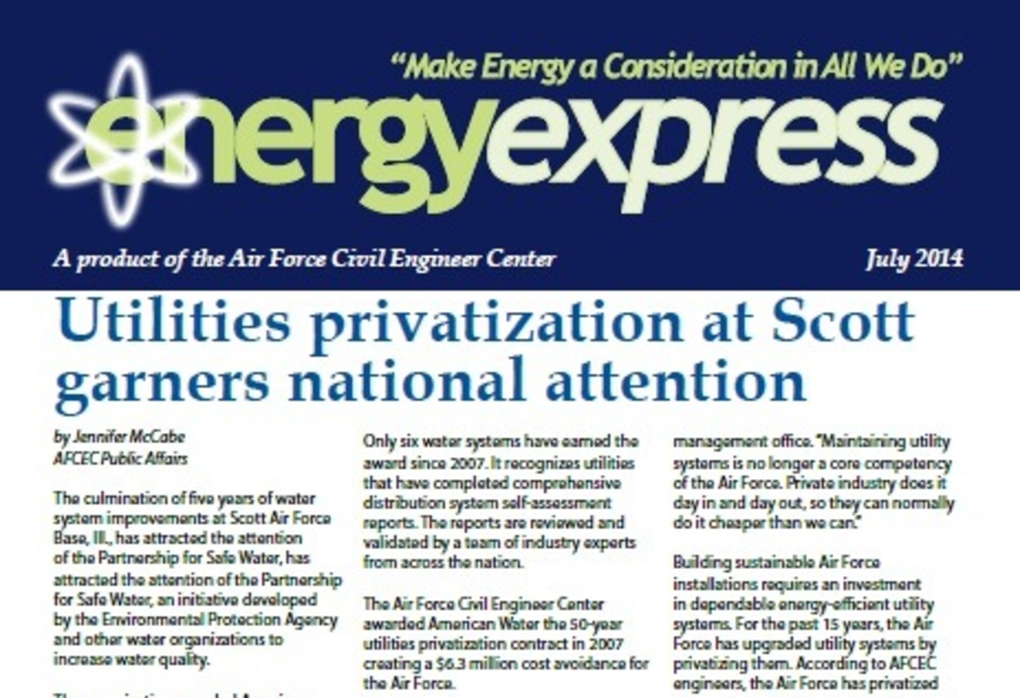 July Energy Express is here Published July 15, 2014 By Air Force Civil Engineer Center Public Affairs TYNDALL AIR FORCE BASE, Fla. -- The Air Force Utilities Privatization program takes the spotlight in this month's Energy Express for earning national attention at Scott Air Force Base, Ill. Find out how water system improvements there are improving life for more than 15,000 Airmen and their families. Also, Nellis AFB, Nev., is set to outdo itself with a 19-megawatt solar array. Once completed, more than 40 percent of the energy needed to power the installation will come from renewable energy. These stories plus, President Obama urges water conservation and other news in "Watts Happening." Click here to view this issue.