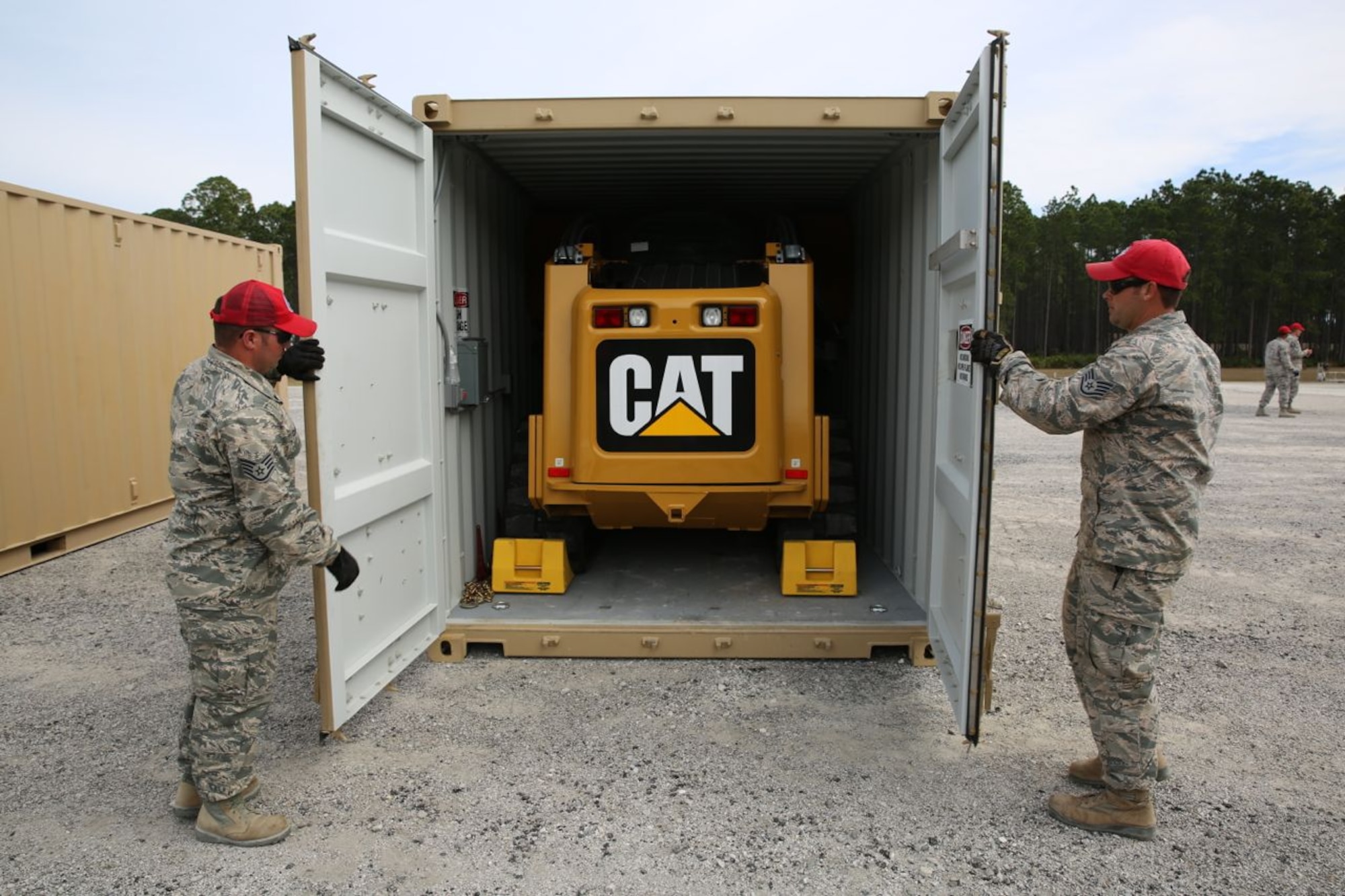 Staff Sgt. David Curry, a member of Det. 1, 823rd RED HORSE Squadron, directs placement of one of five containers that make up the sustainment pavement repair kit, or SuPR kit, at the Silver Flag exercise site at Tyndall Air Force Base, Fla., on March 11, 2014. The kit contains more than 350 types of items condensed into five 20-foot shipping containers and has the equipment, tools and materials for Air Force pavement and equipment specialists to repair deployed airfields. The kit is now part of Air Force civil engineer contingency training at locations like Silver Flag. (U.S. Air Force photo/Eddie Green)