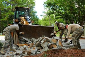 U.S. Airmen assigned to the 20th Civil Engineer Squadron worked as a team to demolish an uneven concrete sidewalk upheaved by tree roots at Shaw Air Force Base, S.C., Aug. 10, 2017.